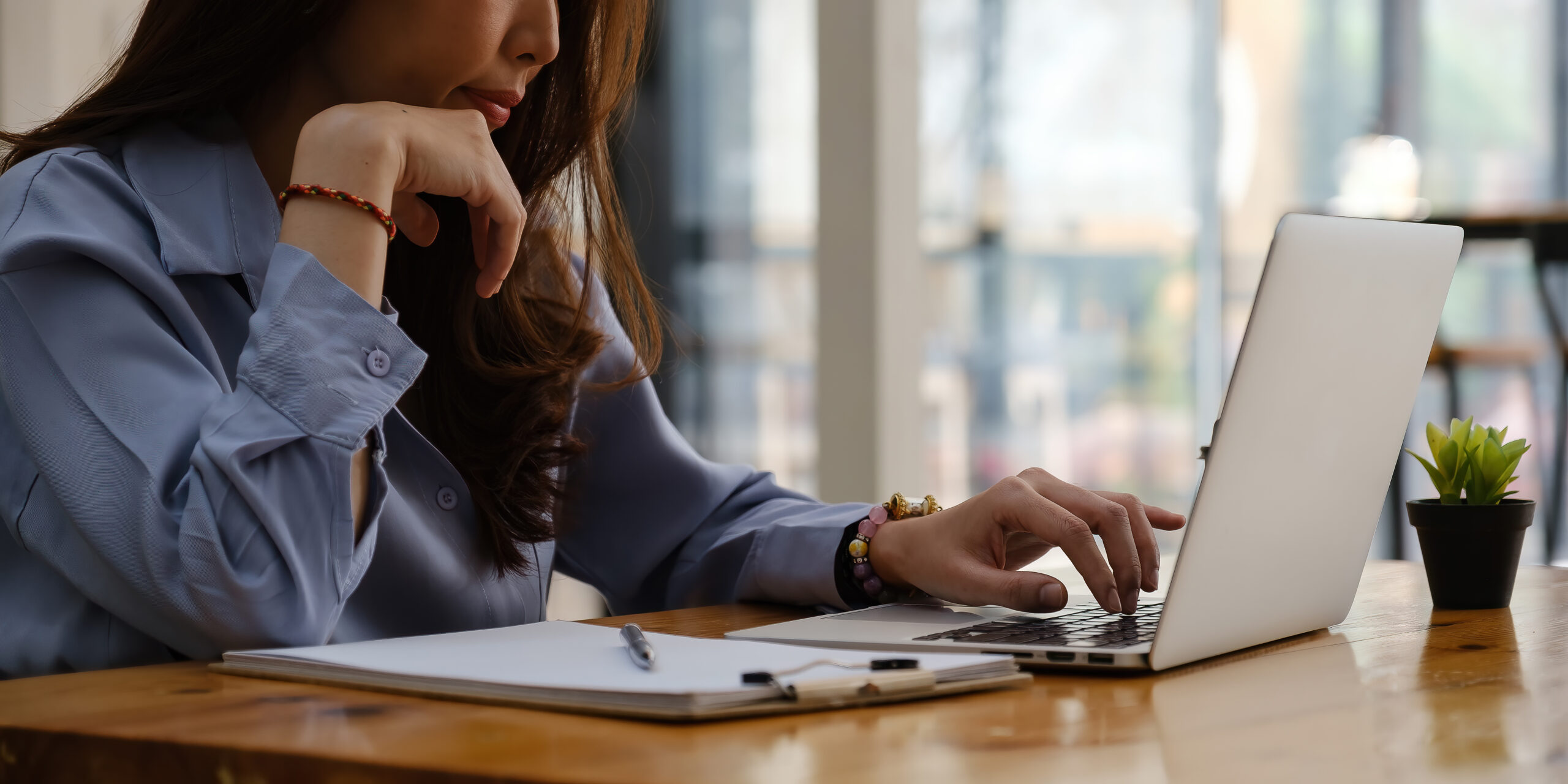 Video conference, Online meeting video call, Portrait of business woman looking at laptop computer screen working or watching webinar on laptop in workplace